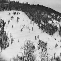 Skikurs für Soldaten mit Mathias Zdarsky (unten) auf einer Waldwiese