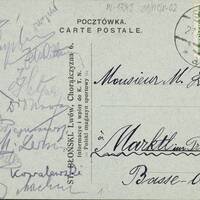 Postkarte (gelaufen), auf der Bildseite Fotografie kaschiert, handschriftlich beschrieben (Bleistift, Tinte), frankiert (5 Heller)